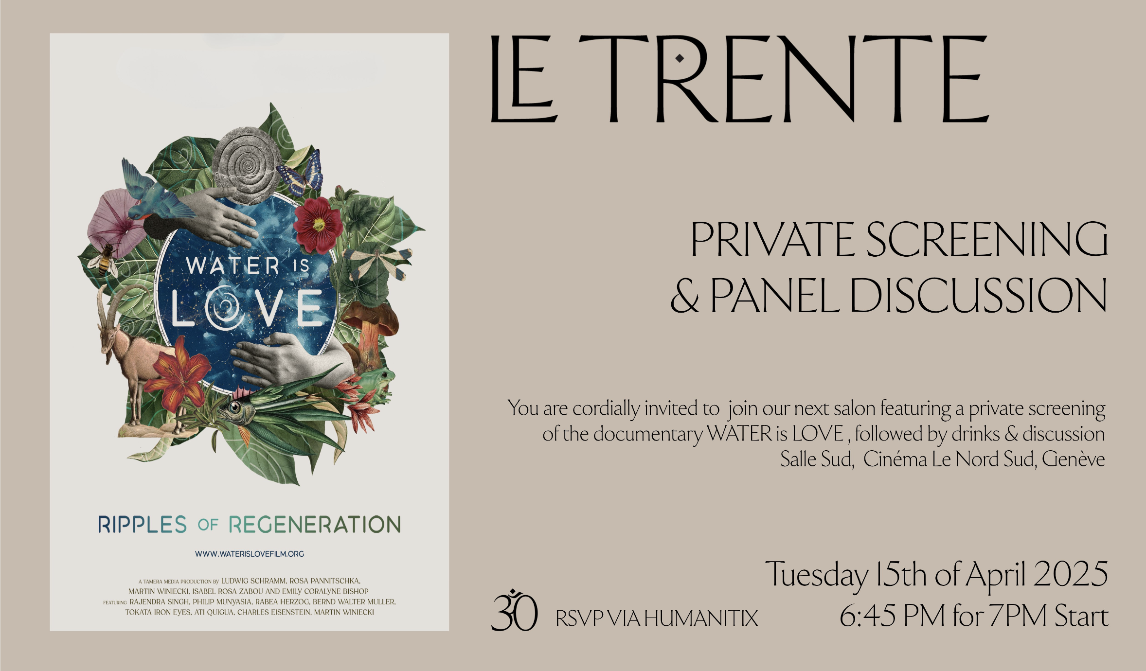 If you're coming through Geneva on April 15th, I'm delighted to extend an invitation for our next salon which includes a private screening of the documentary "Water is Love, Ripples of Generation," followed by a panel discussion and drinks.